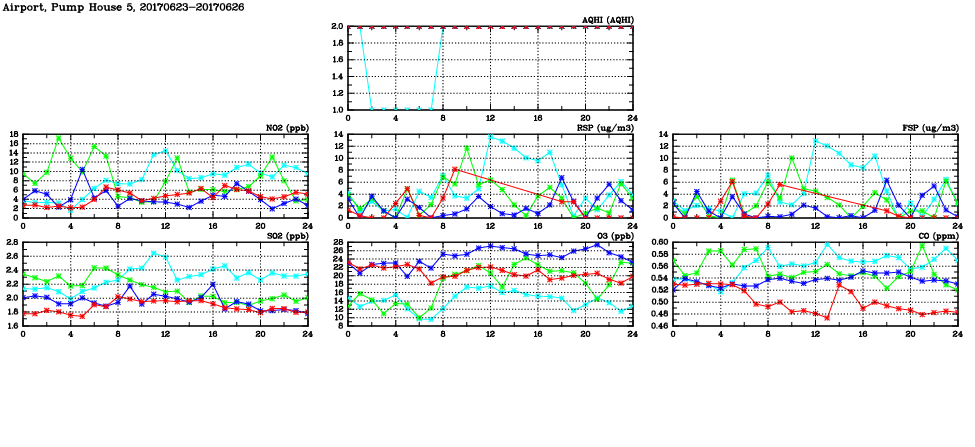 | Air Quality Data Time Series in Airport, Pump House 5 (2017/06/26) | ( Line colors: Day -3 Day -2 Day -1 Current day ) | 2D Map Current AQHI |