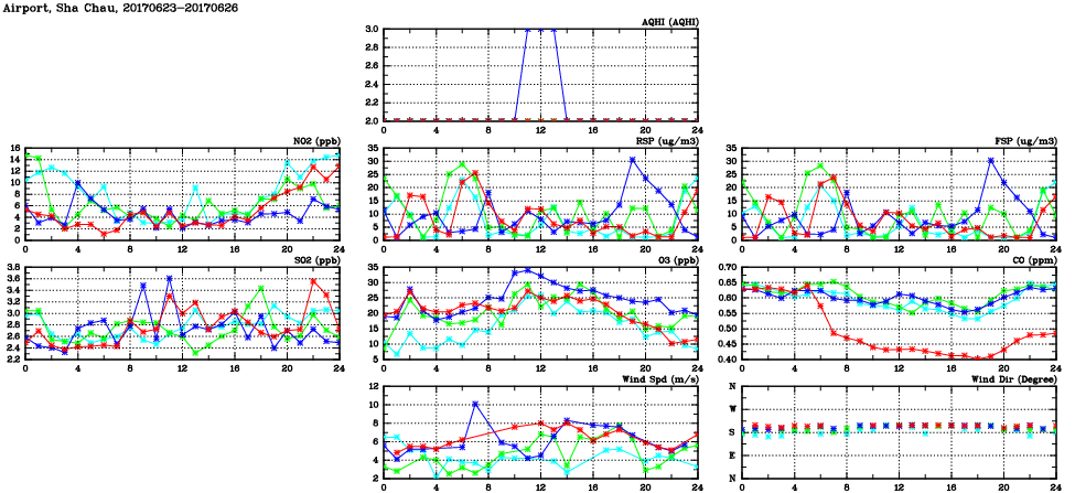 | Air Quality Data Time Series in Airport, Sha Chau (2017/06/26) | ( Line colors: Day -3 Day -2 Day -1 Current day ) | 2D Map Current AQHI |