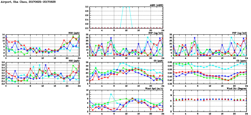 | Air Quality Data Time Series in Airport, Sha Chau (2017/06/28) | ( Line colors: Day -3 Day -2 Day -1 Current day ) | 2D Map Current AQHI |