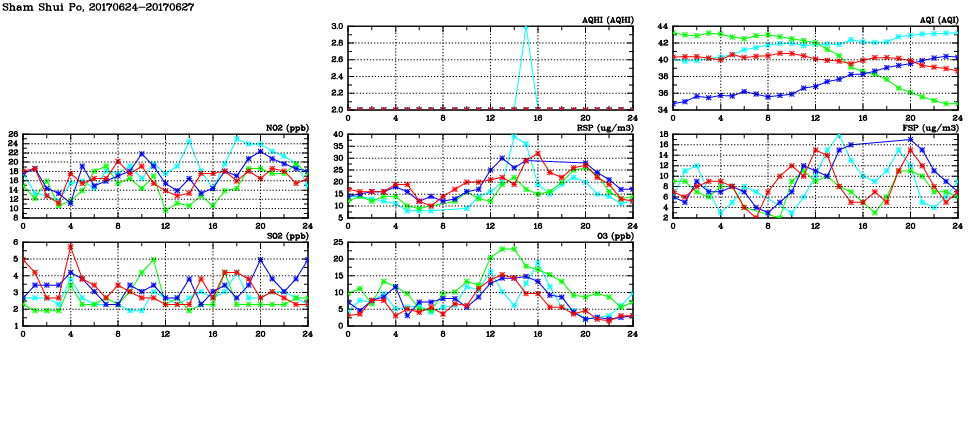 | Air Quality Data Time Series in Sham Shui Po (2017/06/27) | ( Line colors: Day -3 Day -2 Day -1 Current day ) | 2D Map Current AQHI |
