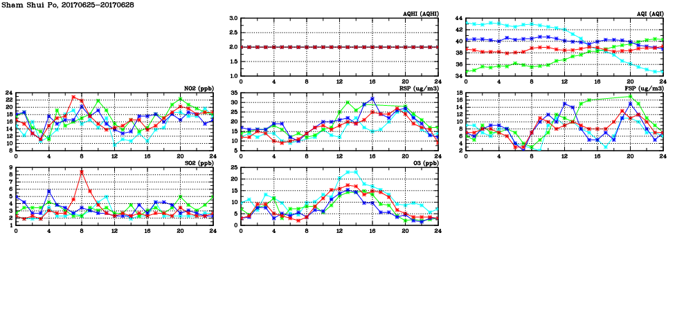 | Air Quality Data Time Series in Sham Shui Po (2017/06/28) | ( Line colors: Day -3 Day -2 Day -1 Current day ) | 2D Map Current AQHI |