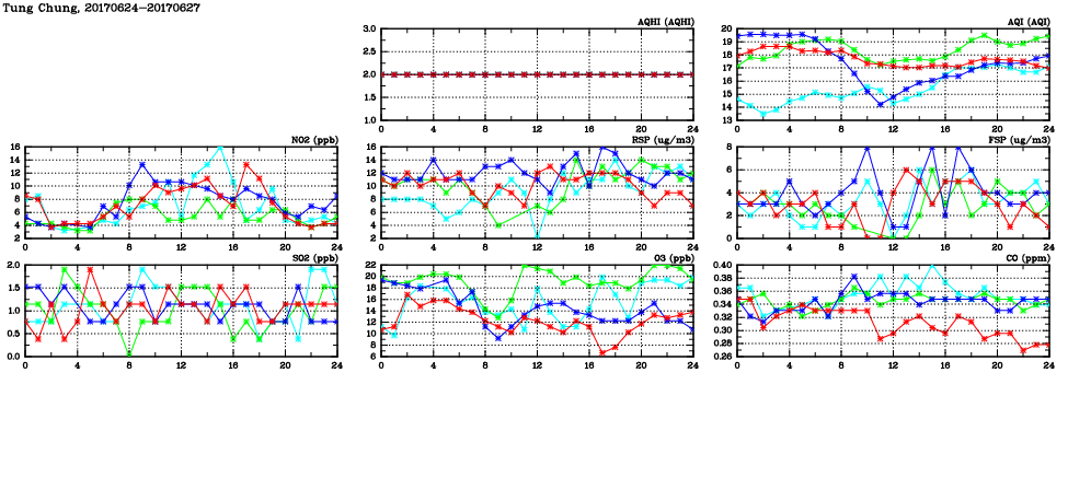 | Air Quality Data Time Series in Tung Chung (2017/06/27) | ( Line colors: Day -3 Day -2 Day -1 Current day ) | 2D Map Current AQHI |