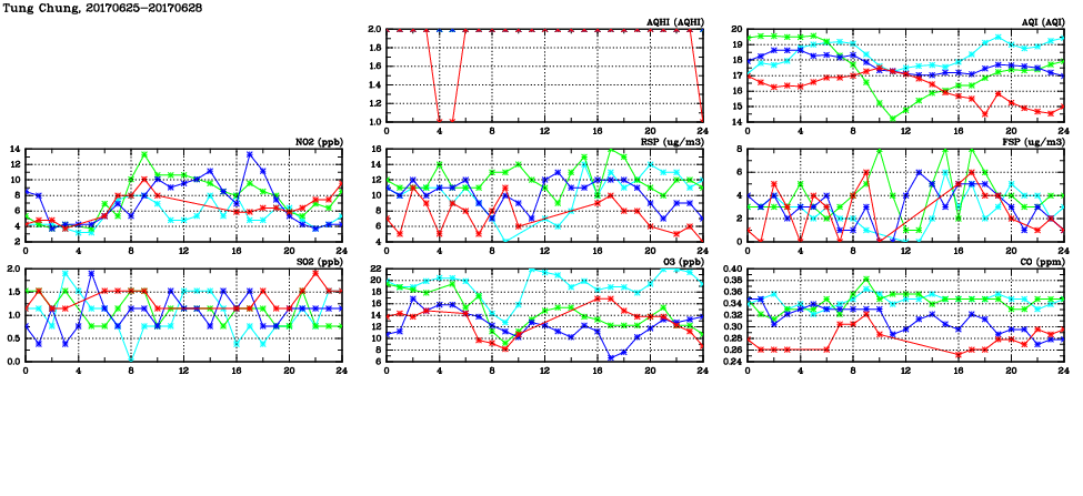 | Air Quality Data Time Series in Tung Chung (2017/06/28) | ( Line colors: Day -3 Day -2 Day -1 Current day ) | 2D Map Current AQHI |
