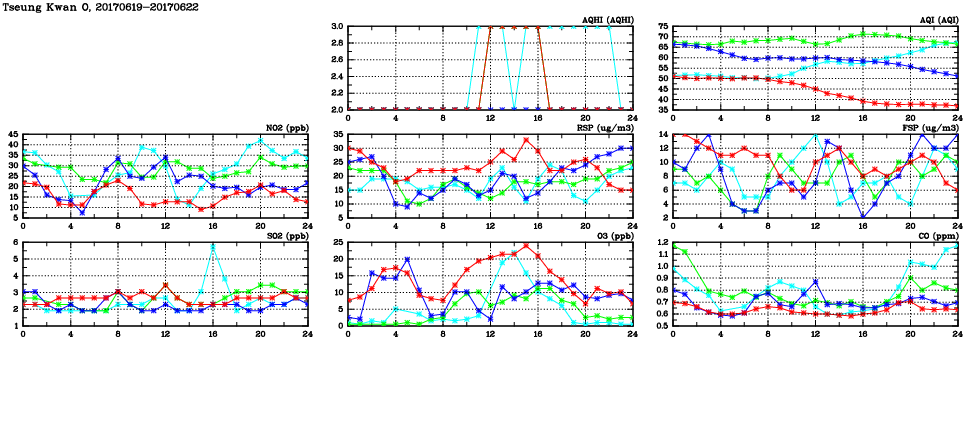 | Air Quality Data Time Series in Tseung Kwan O (2017/06/22) | ( Line colors: Day -3 Day -2 Day -1 Current day ) | 2D Map Current AQHI |