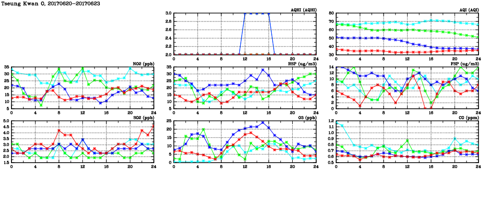 | Air Quality Data Time Series in Tseung Kwan O (2017/06/23) | ( Line colors: Day -3 Day -2 Day -1 Current day ) | 2D Map Current AQHI |