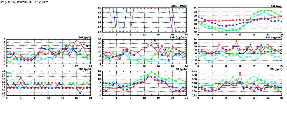 | Air Quality Data Time Series in Tap Mun (2017/06/27) | ( Line colors: Day -3 Day -2 Day -1 Current day ) | 2D Map Current AQHI |