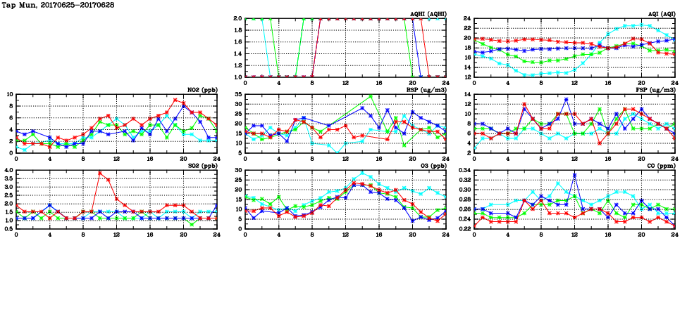 | Air Quality Data Time Series in Tap Mun (2017/06/28) | ( Line colors: Day -3 Day -2 Day -1 Current day ) | 2D Map Current AQHI |