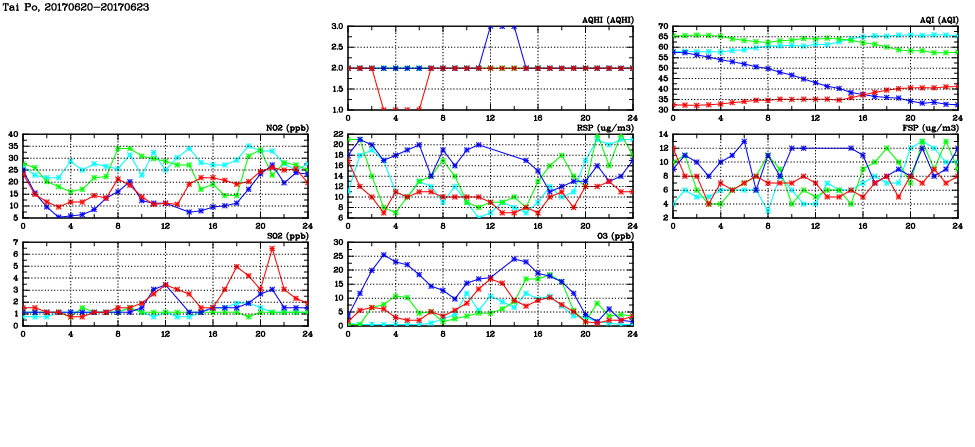 | Air Quality Data Time Series in Tai Po (2017/06/23) | ( Line colors: Day -3 Day -2 Day -1 Current day ) | 2D Map Current AQHI |