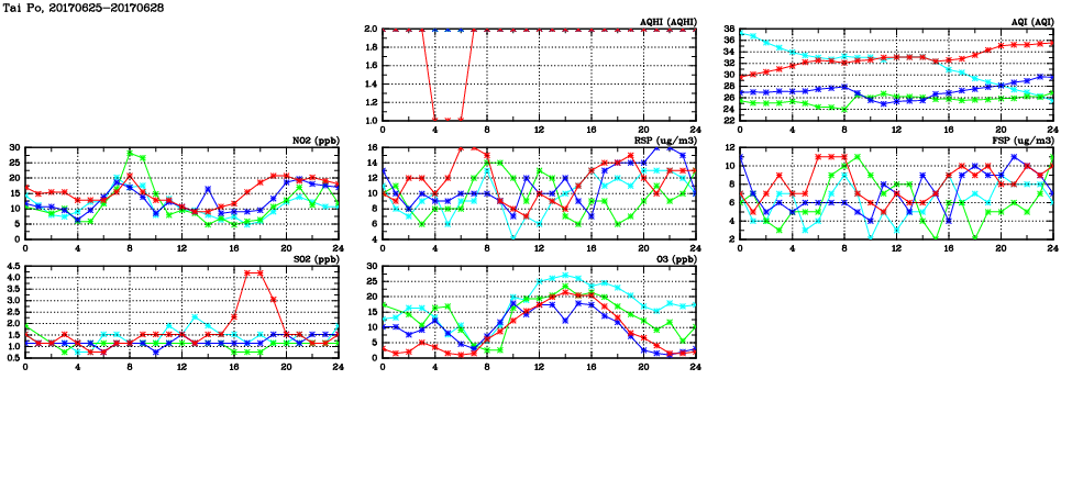| Air Quality Data Time Series in Tai Po (2017/06/28) | ( Line colors: Day -3 Day -2 Day -1 Current day ) | 2D Map Current AQHI |