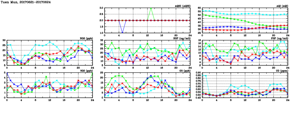 | Air Quality Data Time Series in Tuen Mun (2017/06/24) | ( Line colors: Day -3 Day -2 Day -1 Current day ) | 2D Map Current AQHI |