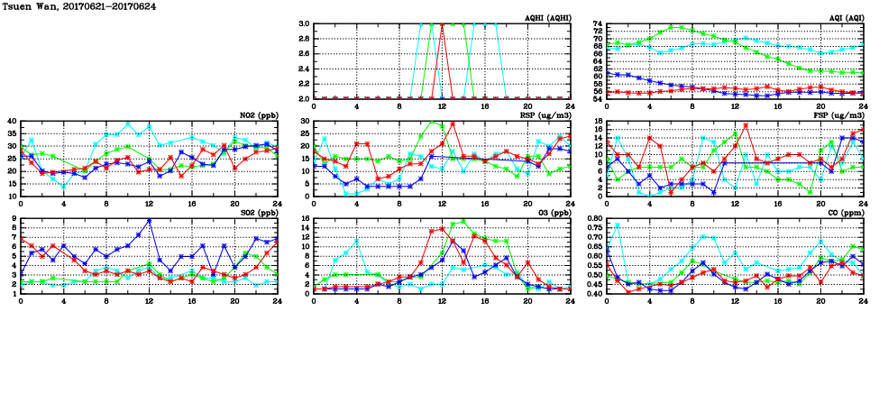 | Air Quality Data Time Series in Tsuen Wan (2017/06/24) | ( Line colors: Day -3 Day -2 Day -1 Current day ) | 2D Map Current AQHI |