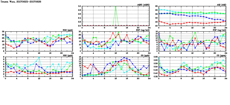 | Air Quality Data Time Series in Tsuen Wan (2017/06/26) | ( Line colors: Day -3 Day -2 Day -1 Current day ) | 2D Map Current AQHI |