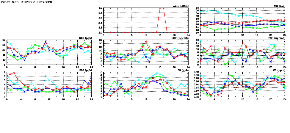 | Air Quality Data Time Series in Tsuen Wan (2017/06/28) | ( Line colors: Day -3 Day -2 Day -1 Current day ) | 2D Map Current AQHI |