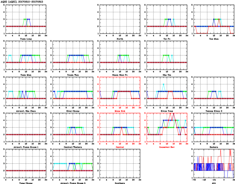 | Air Quality Data Time Series for AQHI (2017/08/13) | ( Line colors: Day -3 Day -2 Day -1 Current day ) | 2D Map Current AQHI |