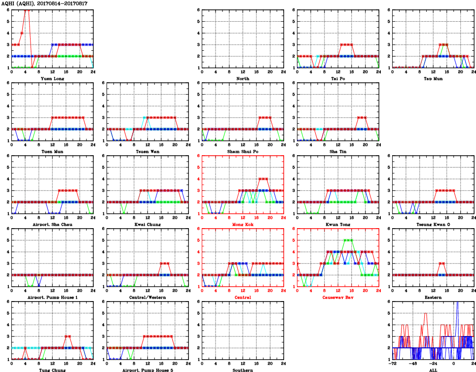 | Air Quality Data Time Series for AQHI (2017/08/17) | ( Line colors: Day -3 Day -2 Day -1 Current day ) | 2D Map Current AQHI |