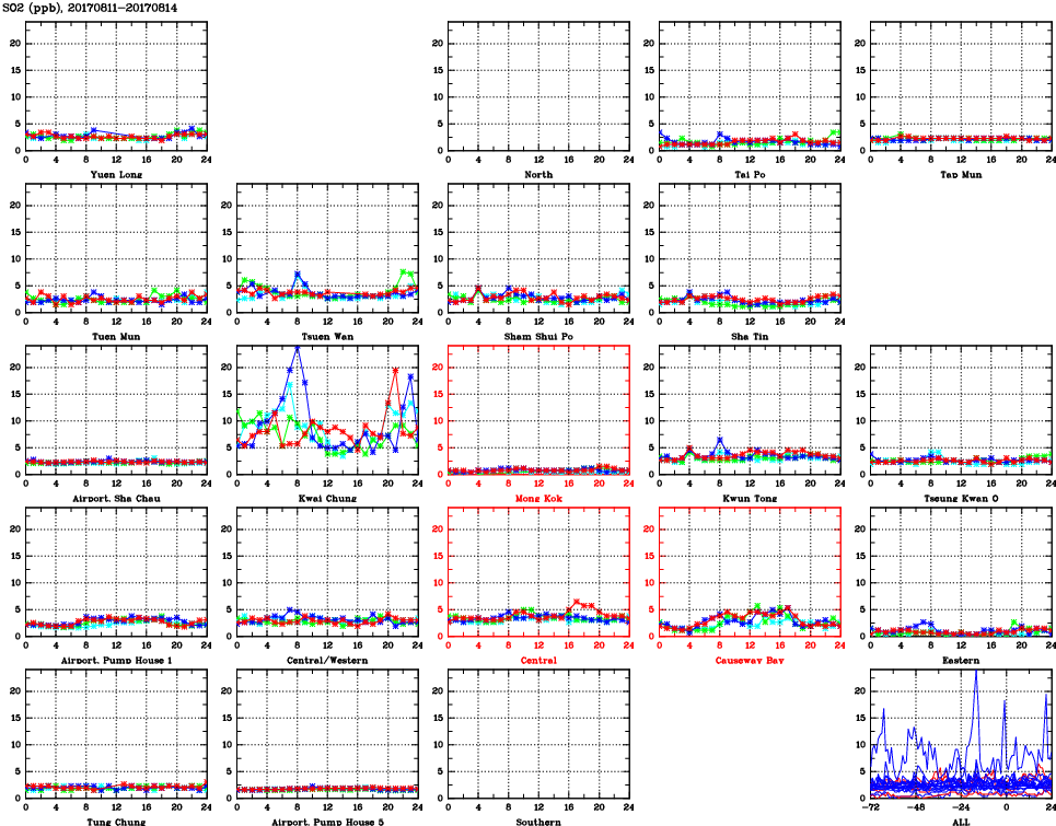| Air Quality Data Time Series for SO2 (2017/08/14) | ( Line colors: Day -3 Day -2 Day -1 Current day ) | 2D Map Current AQHI |