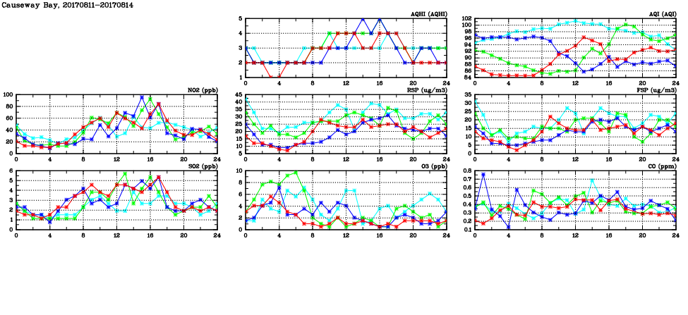 | Air Quality Data Time Series in Causeway Bay (2017/08/14) | ( Line colors: Day -3 Day -2 Day -1 Current day ) | 2D Map Current AQHI |