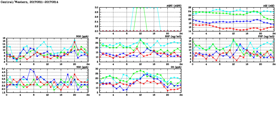 | Air Quality Data Time Series in Central/Western (2017/08/14) | ( Line colors: Day -3 Day -2 Day -1 Current day ) | 2D Map Current AQHI |