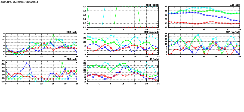 | Air Quality Data Time Series in Eastern (2017/08/14) | ( Line colors: Day -3 Day -2 Day -1 Current day ) | 2D Map Current AQHI |