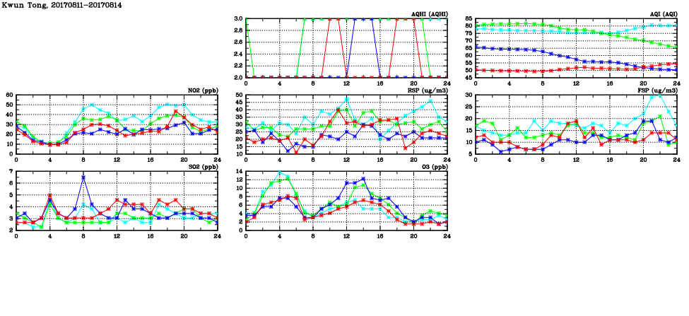 | Air Quality Data Time Series in Kwun Tong (2017/08/14) | ( Line colors: Day -3 Day -2 Day -1 Current day ) | 2D Map Current AQHI |