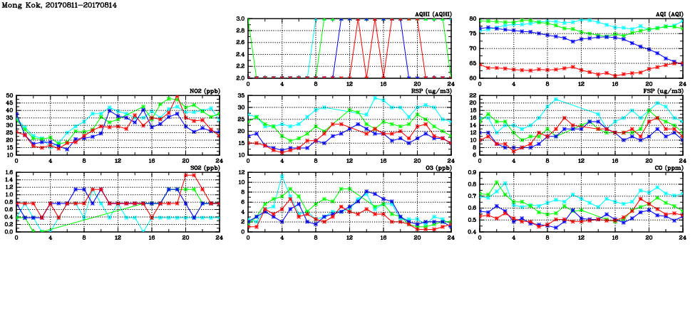 | Air Quality Data Time Series in Mong Kok (2017/08/14) | ( Line colors: Day -3 Day -2 Day -1 Current day ) | 2D Map Current AQHI |