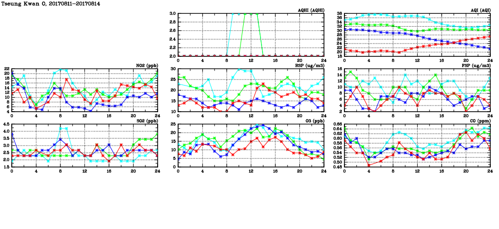 | Air Quality Data Time Series in Tseung Kwan O (2017/08/14) | ( Line colors: Day -3 Day -2 Day -1 Current day ) | 2D Map Current AQHI |