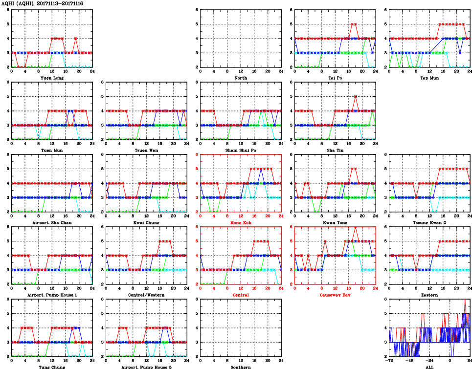 | Air Quality Data Time Series for AQHI (2017/11/16) | ( Line colors: Day -3 Day -2 Day -1 Current day ) | 2D Map Current AQHI |