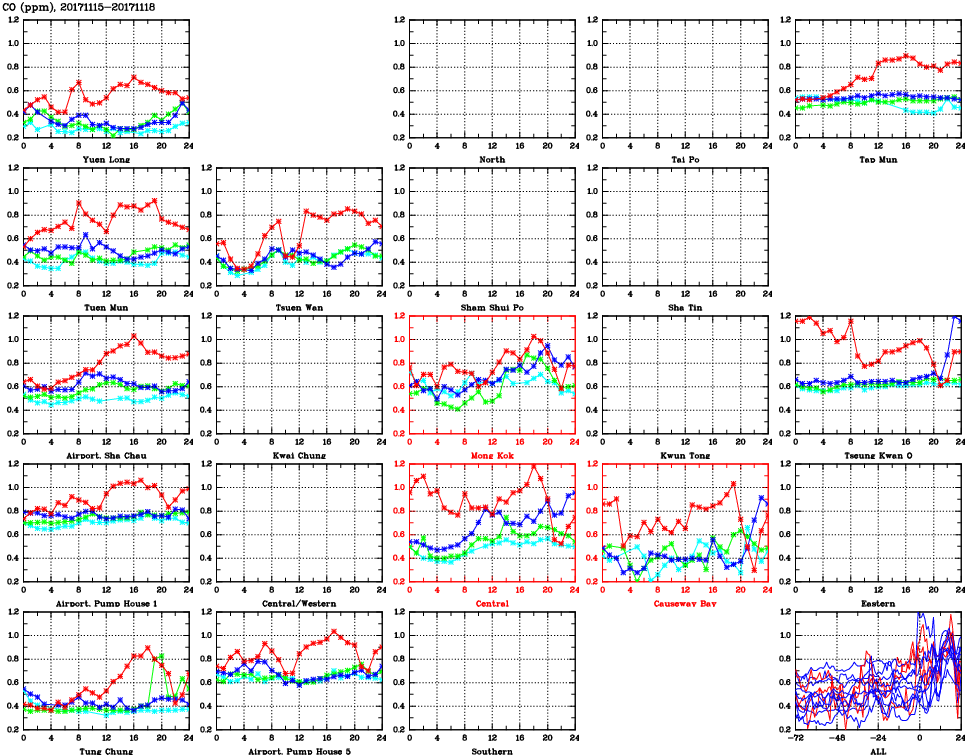 | Air Quality Data Time Series for CO (2017/11/18) | ( Line colors: Day -3 Day -2 Day -1 Current day ) | 2D Map Current AQHI |