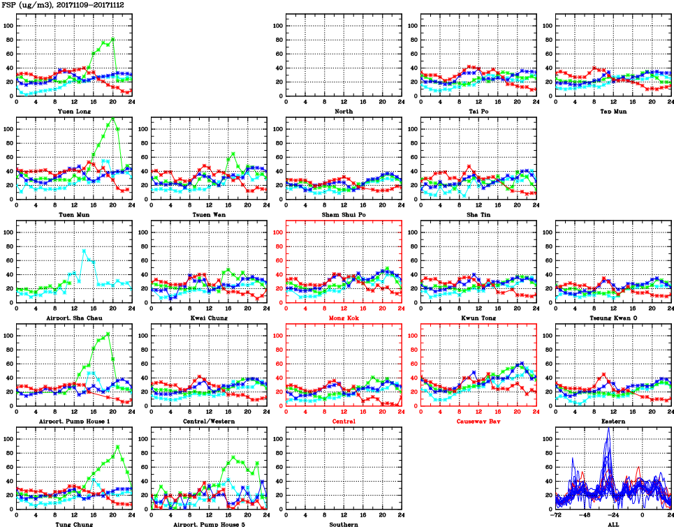 | Air Quality Data Time Series for FSP (2017/11/12) | ( Line colors: Day -3 Day -2 Day -1 Current day ) | 2D Map Current AQHI |