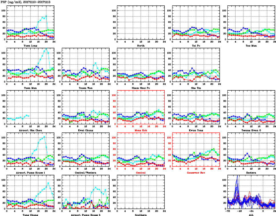 | Air Quality Data Time Series for FSP (2017/11/13) | ( Line colors: Day -3 Day -2 Day -1 Current day ) | 2D Map Current AQHI |