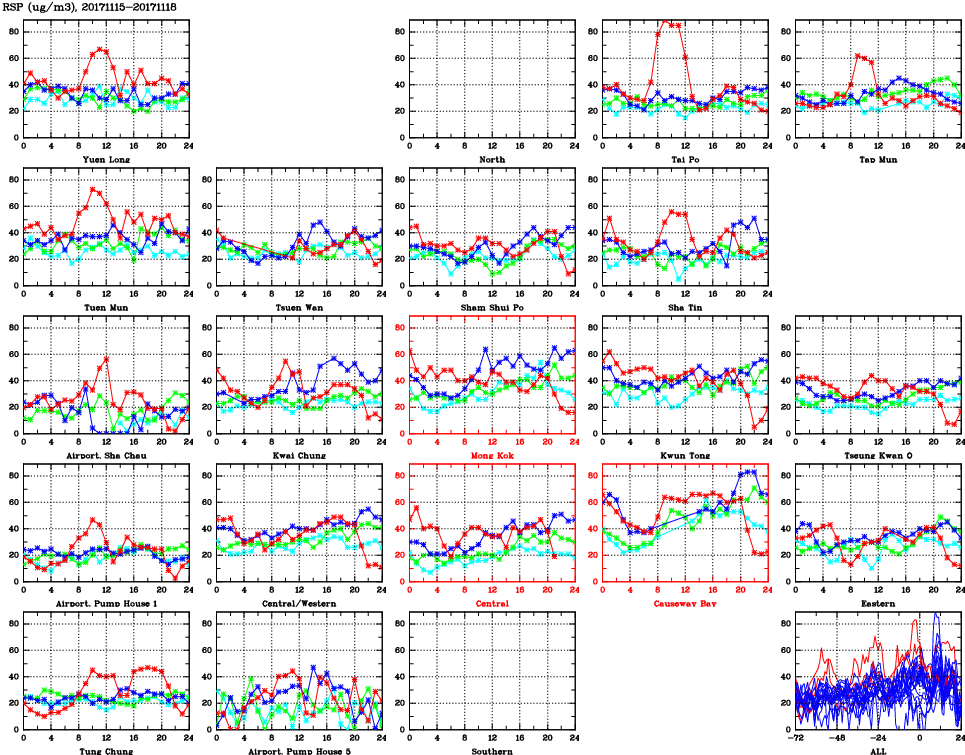 | Air Quality Data Time Series for RSP (2017/11/18) | ( Line colors: Day -3 Day -2 Day -1 Current day ) | 2D Map Current AQHI |