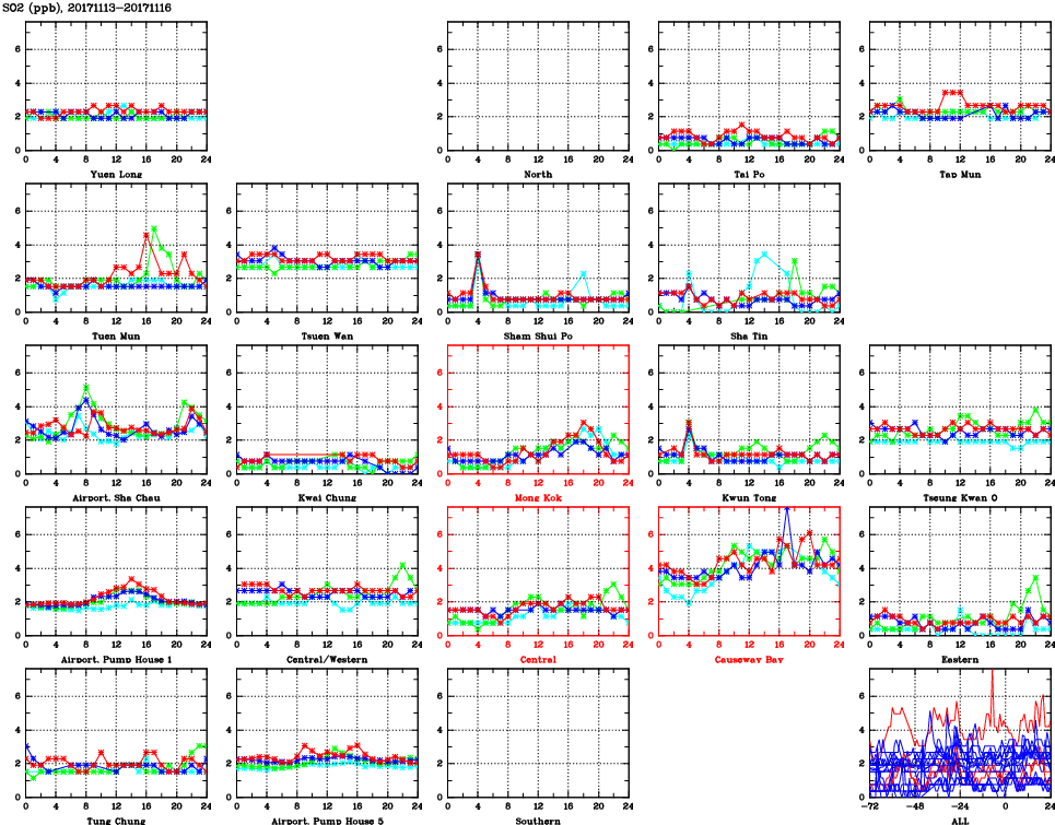 | Air Quality Data Time Series for SO2 (2017/11/16) | ( Line colors: Day -3 Day -2 Day -1 Current day ) | 2D Map Current AQHI |