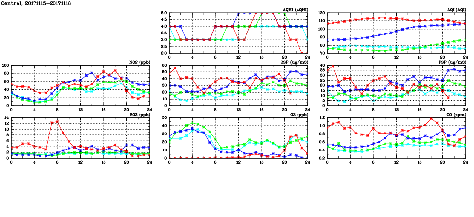 | Air Quality Data Time Series in Central (2017/11/18) | ( Line colors: Day -3 Day -2 Day -1 Current day ) | 2D Map Current AQHI |