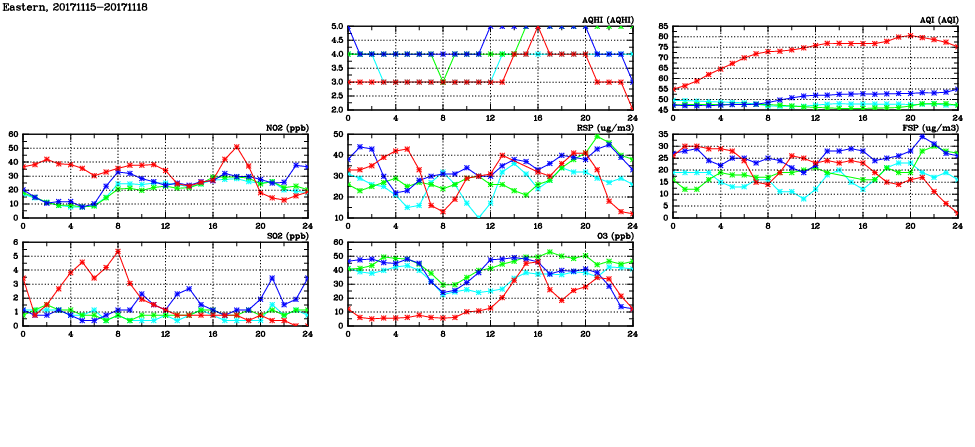 | Air Quality Data Time Series in Eastern (2017/11/18) | ( Line colors: Day -3 Day -2 Day -1 Current day ) | 2D Map Current AQHI |