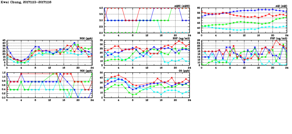 | Air Quality Data Time Series in Kwai Chung (2017/11/16) | ( Line colors: Day -3 Day -2 Day -1 Current day ) | 2D Map Current AQHI |