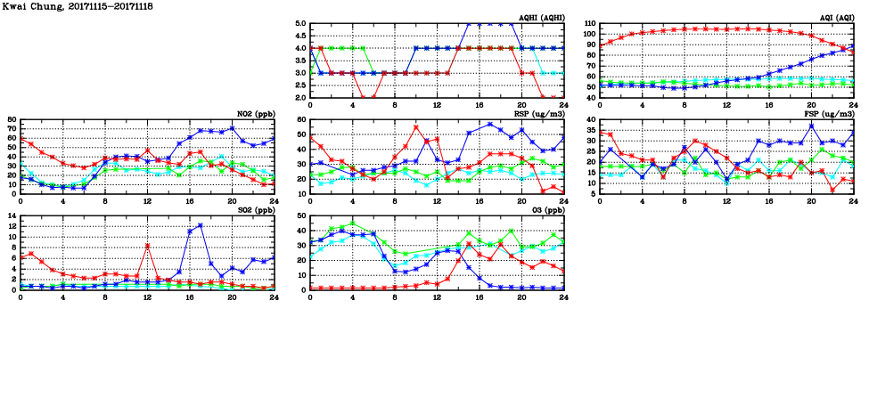 | Air Quality Data Time Series in Kwai Chung (2017/11/18) | ( Line colors: Day -3 Day -2 Day -1 Current day ) | 2D Map Current AQHI |