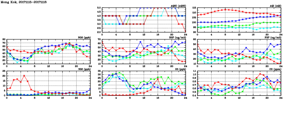 | Air Quality Data Time Series in Mong Kok (2017/11/18) | ( Line colors: Day -3 Day -2 Day -1 Current day ) | 2D Map Current AQHI |