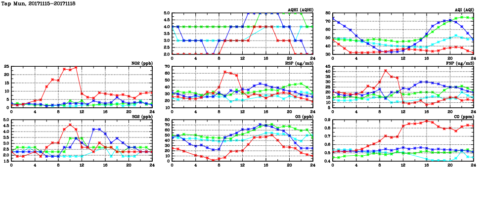 | Air Quality Data Time Series in Tap Mun (2017/11/18) | ( Line colors: Day -3 Day -2 Day -1 Current day ) | 2D Map Current AQHI |