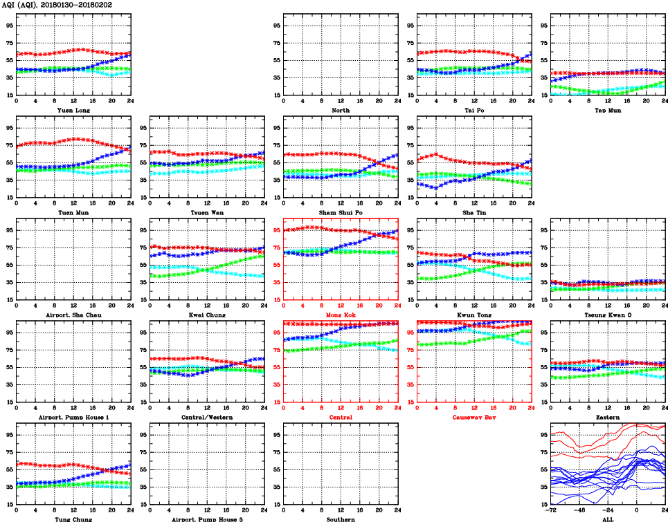 | Air Quality Data Time Series for AQI (2018/02/02) | ( Line colors: Day -3 Day -2 Day -1 Current day ) | 2D Map Current AQHI |