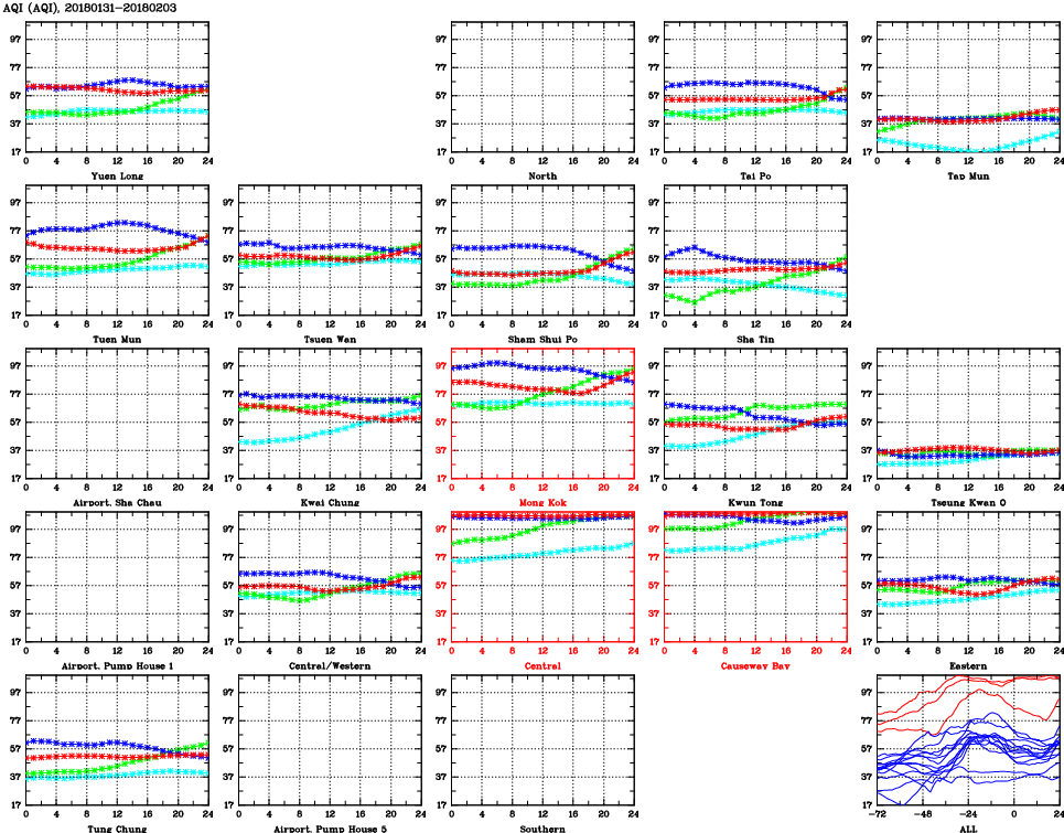 | Air Quality Data Time Series for AQI (2018/02/03) | ( Line colors: Day -3 Day -2 Day -1 Current day ) | 2D Map Current AQHI |