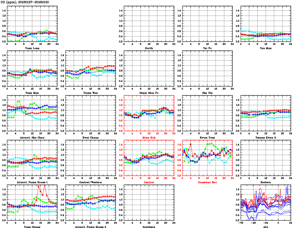 | Air Quality Data Time Series for CO (2018/01/30) | ( Line colors: Day -3 Day -2 Day -1 Current day ) | 2D Map Current AQHI |
