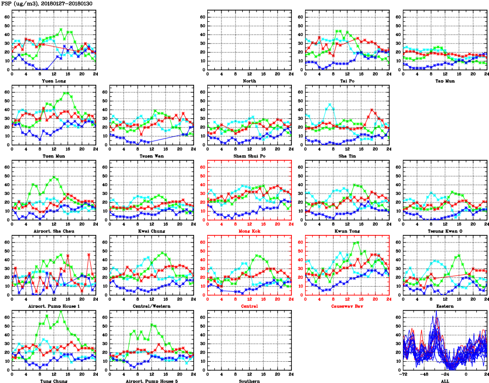 | Air Quality Data Time Series for FSP (2018/01/30) | ( Line colors: Day -3 Day -2 Day -1 Current day ) | 2D Map Current AQHI |