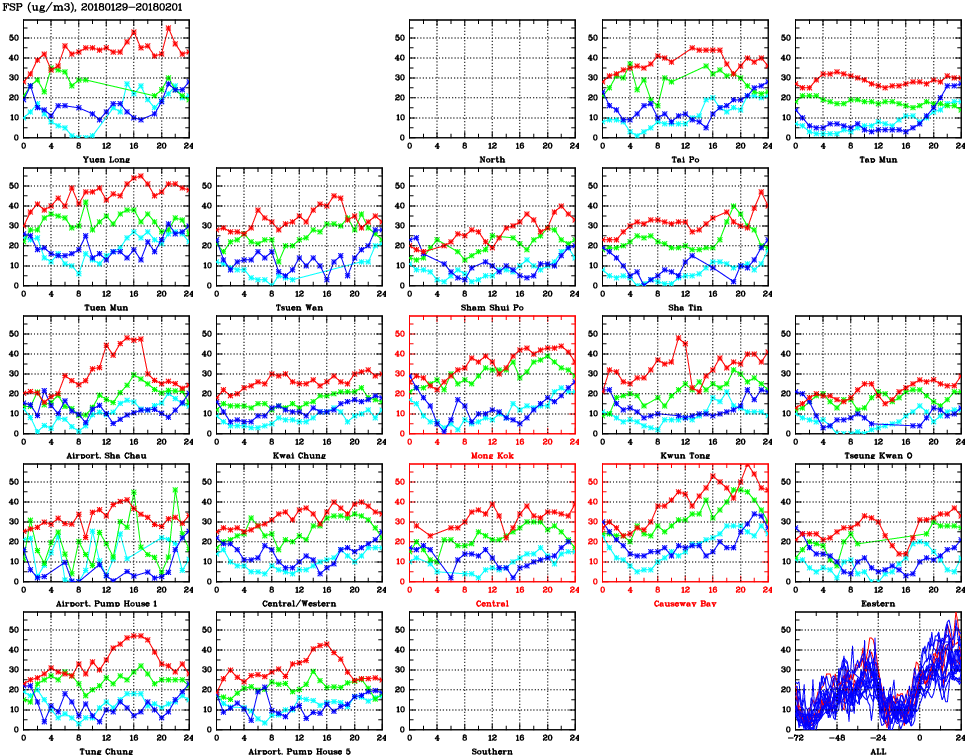 | Air Quality Data Time Series for FSP (2018/02/01) | ( Line colors: Day -3 Day -2 Day -1 Current day ) | 2D Map Current AQHI |
