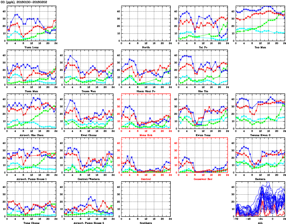 | Air Quality Data Time Series for O3 (2018/02/02) | ( Line colors: Day -3 Day -2 Day -1 Current day ) | 2D Map Current AQHI |