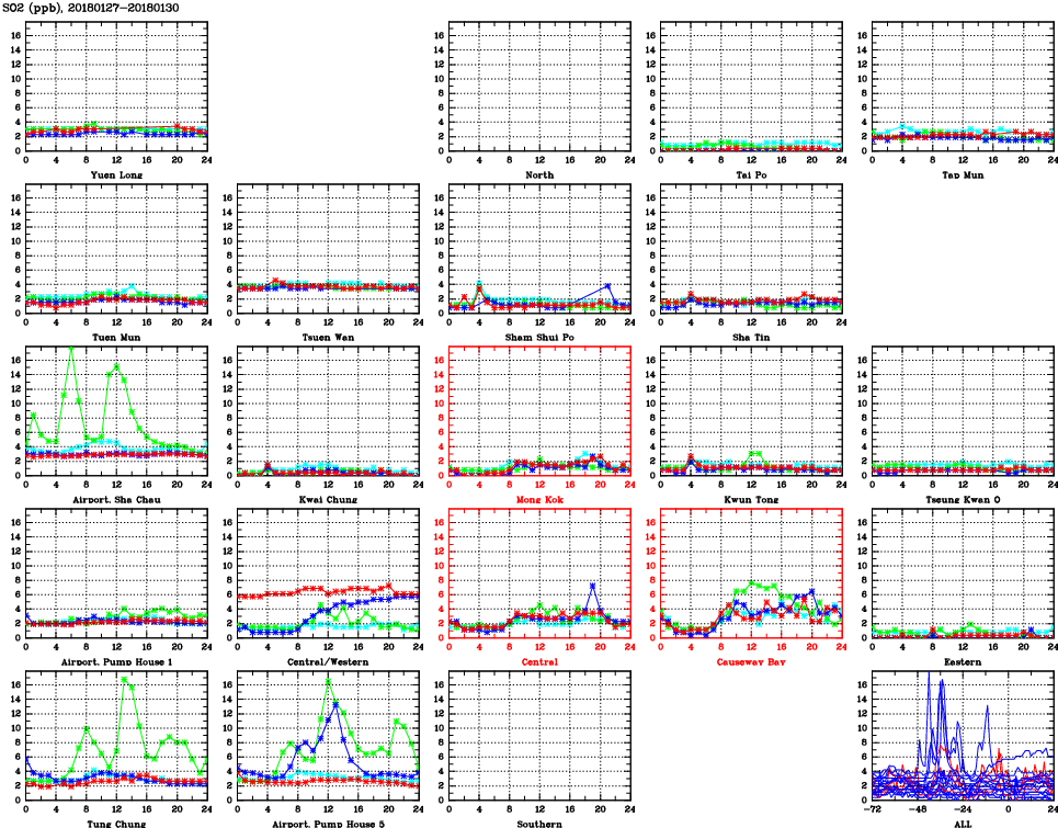 | Air Quality Data Time Series for SO2 (2018/01/30) | ( Line colors: Day -3 Day -2 Day -1 Current day ) | 2D Map Current AQHI |
