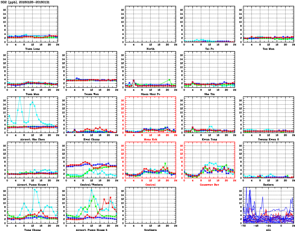 | Air Quality Data Time Series for SO2 (2018/01/31) | ( Line colors: Day -3 Day -2 Day -1 Current day ) | 2D Map Current AQHI |