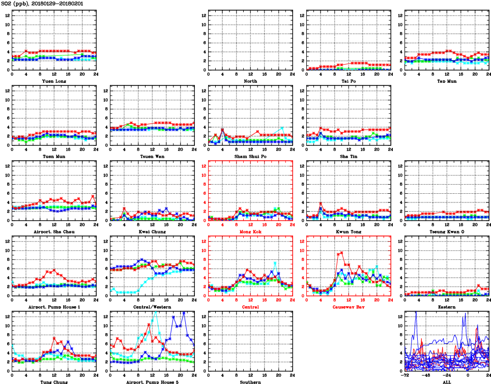 | Air Quality Data Time Series for SO2 (2018/02/01) | ( Line colors: Day -3 Day -2 Day -1 Current day ) | 2D Map Current AQHI |