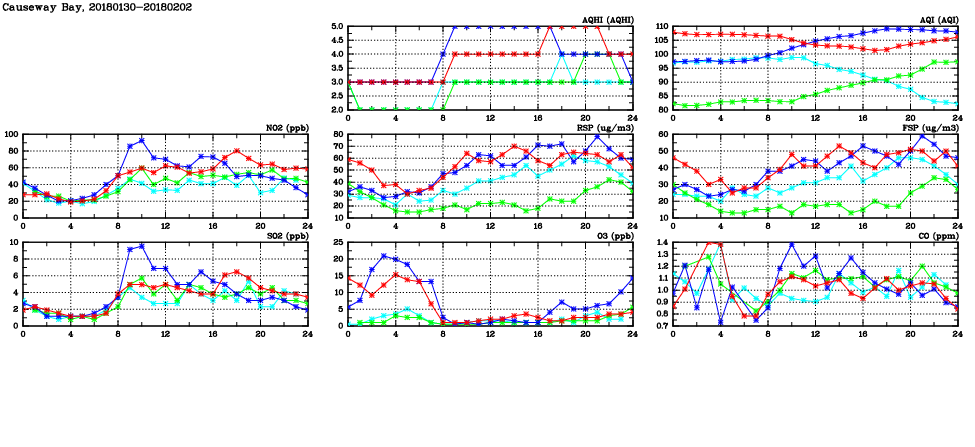| Air Quality Data Time Series in Causeway Bay (2018/02/02) | ( Line colors: Day -3 Day -2 Day -1 Current day ) | 2D Map Current AQHI |