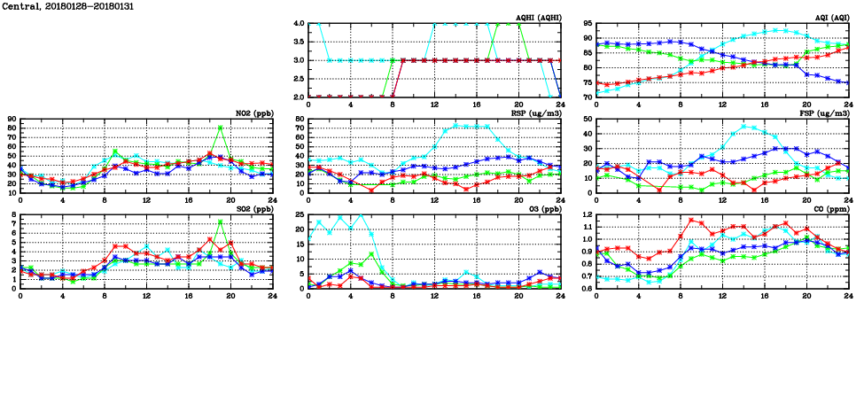 | Air Quality Data Time Series in Central (2018/01/31) | ( Line colors: Day -3 Day -2 Day -1 Current day ) | 2D Map Current AQHI |
