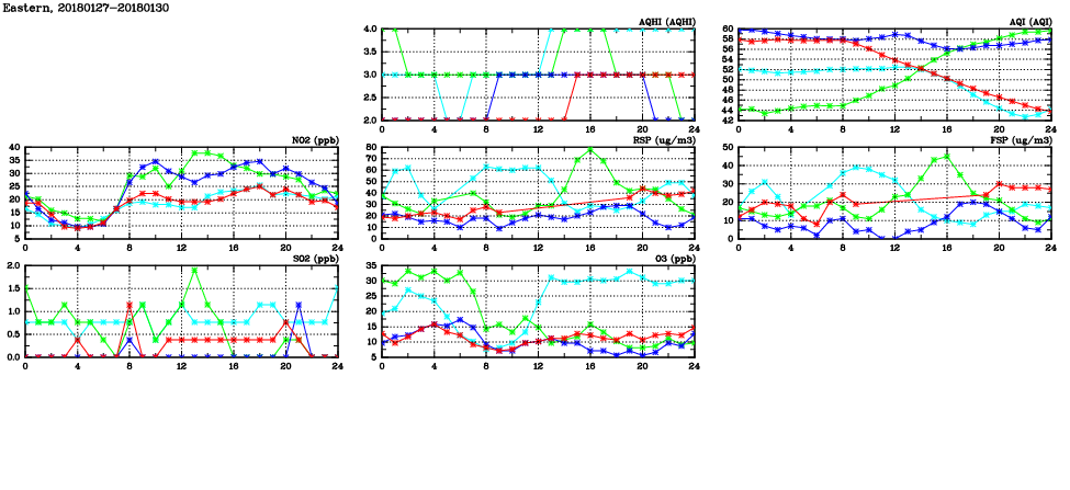 | Air Quality Data Time Series in Eastern (2018/01/30) | ( Line colors: Day -3 Day -2 Day -1 Current day ) | 2D Map Current AQHI |